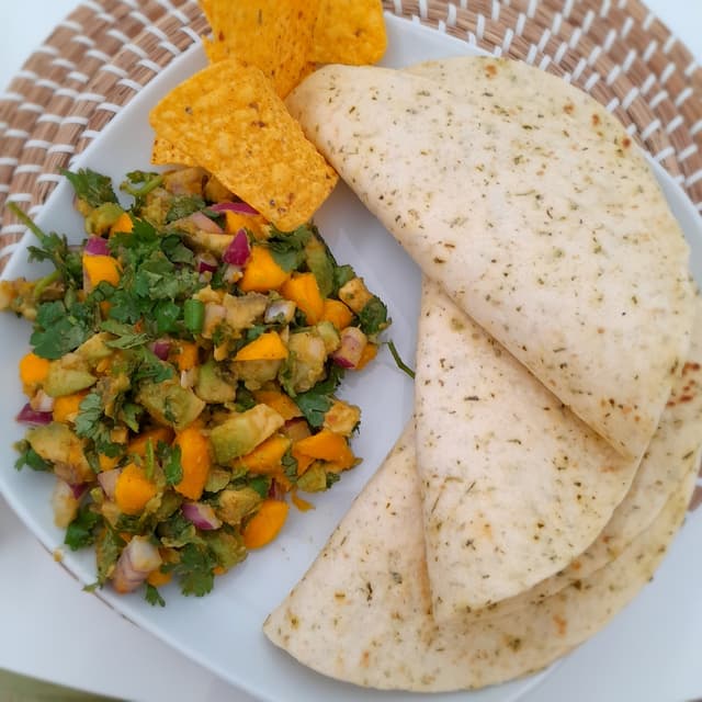 Tortilla wraps with supposed #garlic flavor, thought I didn't taste it. The tortillas themselves look good, have a more spongy texture than "normal" ones and hold up well when stuffed. Maybe they have to be heated to release the flavor? We ate them at room temp with some sweet chili cream cheese inside along with a mango-avocado salsa I whipped up.
