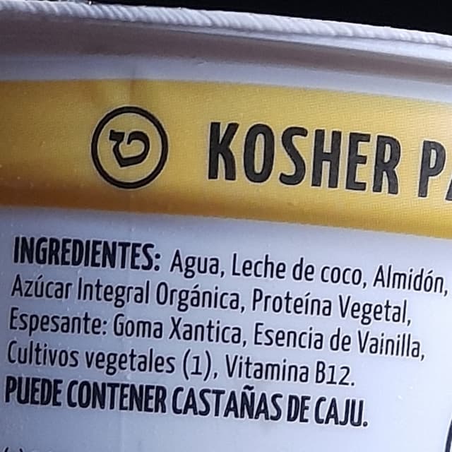 Agua, leche de coco, almidón, azúcar integral orgánica, proteína vegetal, espesante: Goma xantica, esencia de vainilla, cultivos vegetales, Vitamina B12.