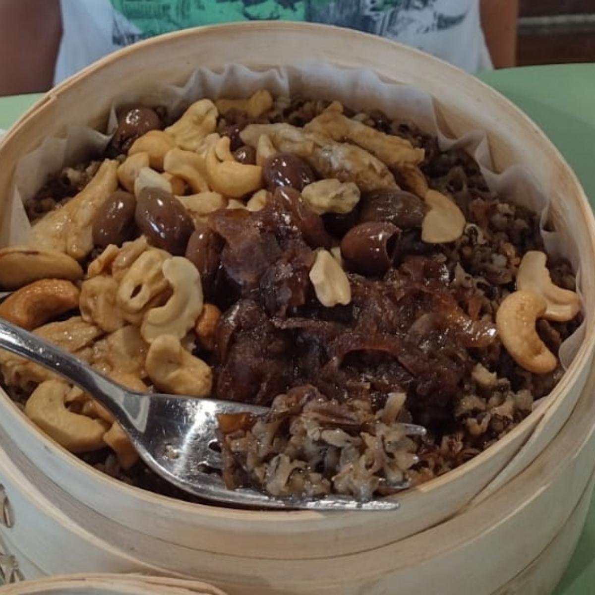 Ottimo pranzo, buono e abbondante, fatto da riso selvatico, pollo HEURA, cipolle caramellate e anacardi, tutto condito con salsa di soia. Bellissima anche la presentazione del cestino.