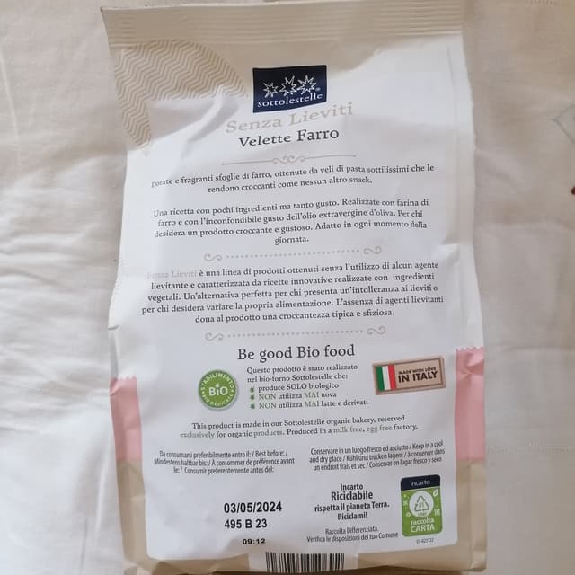 Sono contenta di aver trovato delle velette, crackers al farro, dato che devo mangiare principalmente a base di farina di farro. Si "sgranocchiano" bene anche da sole, ma spesso ci spalmo sopra la nuova Philadelphia veg o il mio formaggio veg homemade, con pezzetti di olive sopra. Confezione in carta!