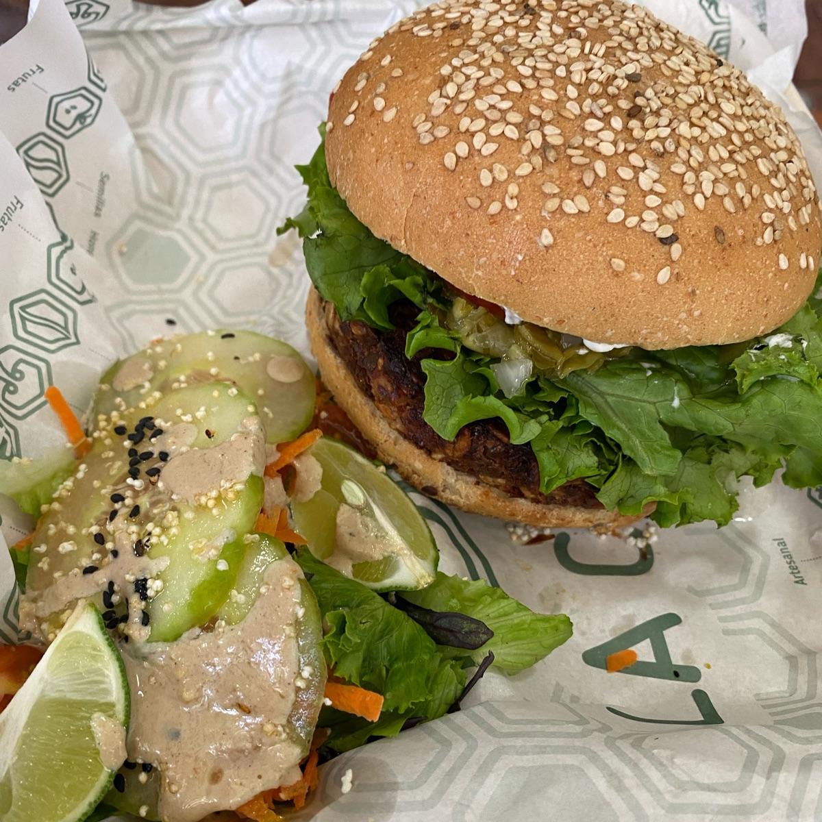 deliciosa hamburguesa de lentejas, muy buena porción y puede venir acompañada de camote frito o ensalada, muy buena 💚