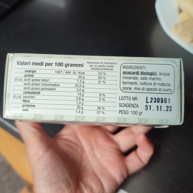 Formaggio a base di anacardi con fermenti e muffe, stile camembert, speziato al curry. Preferisco la versione al naturale di questi formaggi ma mi è comunque piaciuto molto, anzi le spezie sono ben bilanciate e danno carattere senza essere troppo marcate. Lo hanno preso degli amici ad una fiera, il costo è decisamente alto (più di 9 euro per 100g) ma in linea con i prodotti di questo tipo a base di anacardi, in questo caso anche giustificato dal fatto che siano biologici.