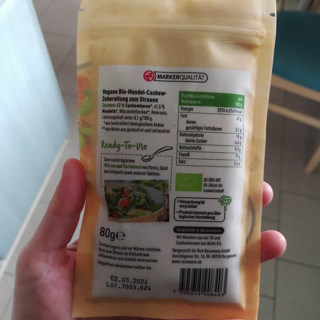 Pasta topping made from cashew and almonds, well seasoned. I like this better than the ready-made vegan grated cheeses that don't melt anyway.