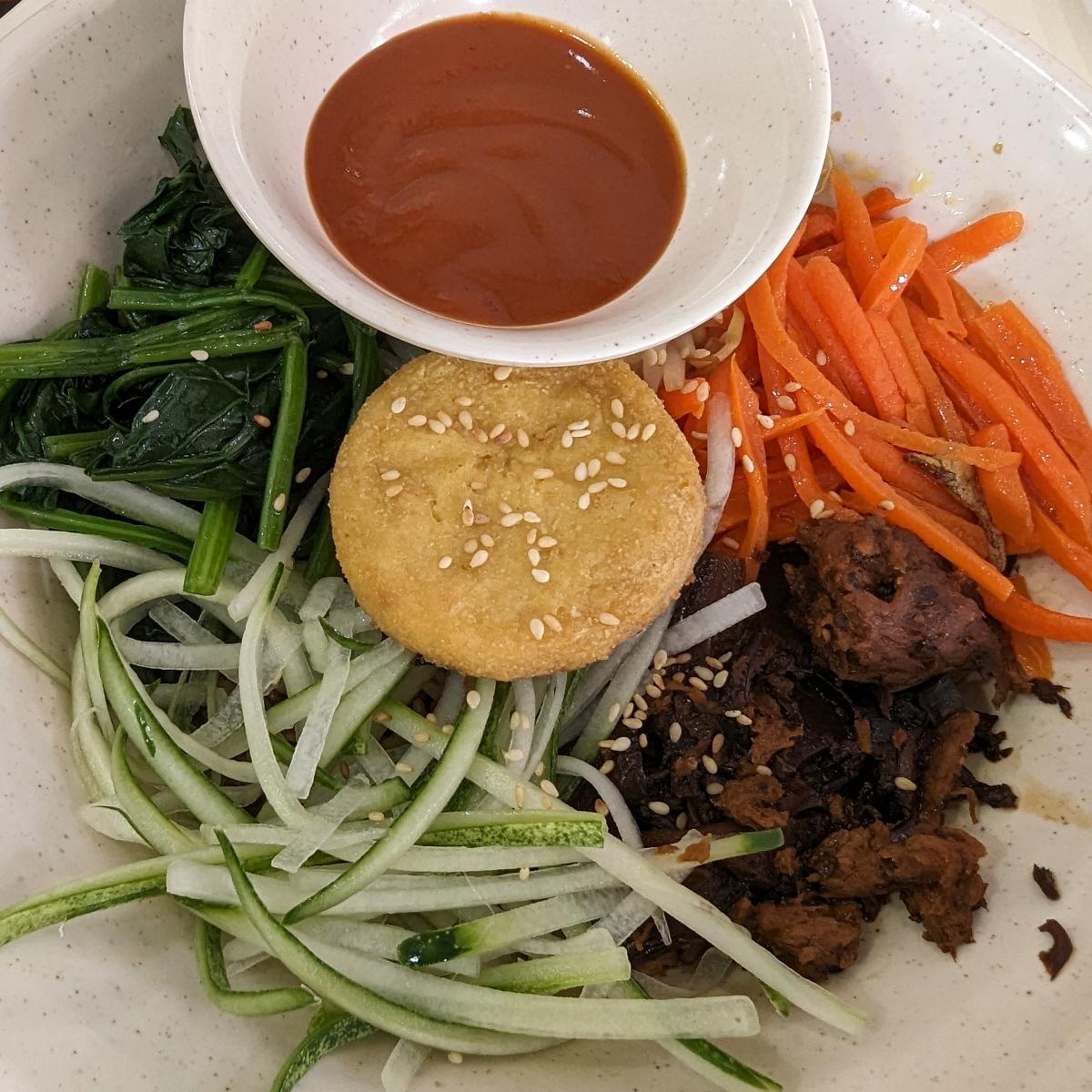 🍘🇰🇷🥕🍄 Appreciate the sauce on the side, as it can get quite salty if the whole thing was used! Unfortunately it isn't in a stone earthenware, but I guess that helps to reduce the oil needed. Mix of fresh and cooked ingredients, on top of brown rice. Simple but good for me~ 😚 #veganbibimbap #veganinsingapore
