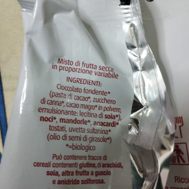 Buon mix di frutta secca in cui prevalgono le noci, purtroppo gli anacardi sono pochissimi come i pezzi di cioccolato fondente. Comunque buono per ricaricare le energie o arricchire lo yogurt. Comprato in promozione.