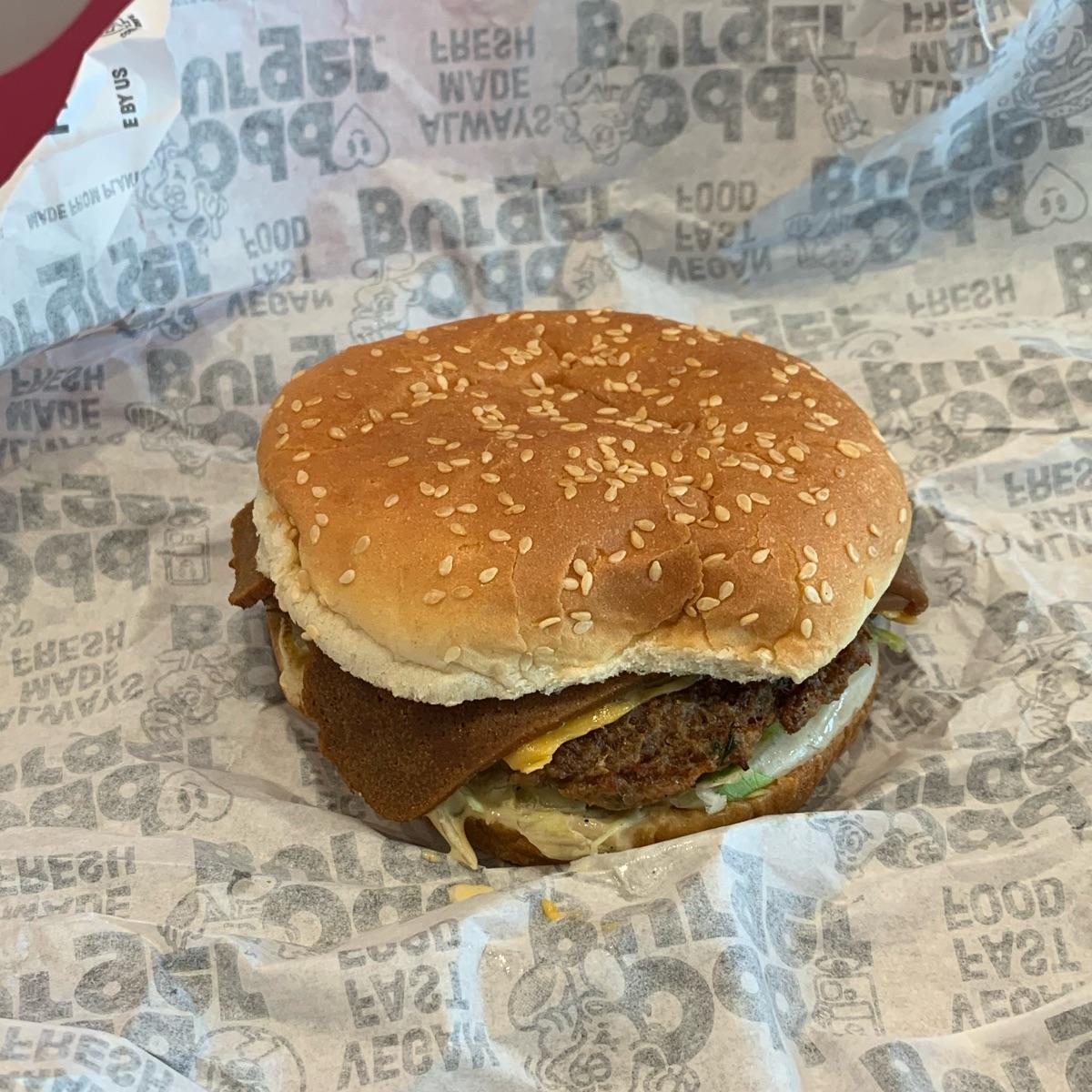 The BacUn Famous Melt is a variation of their Famous Burger (their vegan version of a Big Mac), but with BacUn (a seitan product). Absolutely delicious!! It had a smash (non-beef) patty, famous sauce, lettuce, non-dairy cheese, pickles, grilled onions on a sesame seed bun. (The order of the toppings should look familiar) 😜