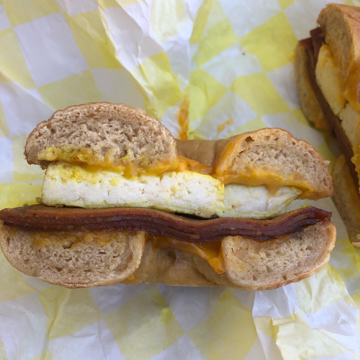 This is a great sandwich on a house made bagel with Lightlife Taylor Ham, a tofu egg, and vegan cheese. The tofu is seasoned with black salt so it has an eggy taste! It’s everything you’d want out of a breakfast sandwich.