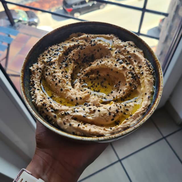 One can chickpeas, salt,pepper, avocado oil, sesame seeds, tahini, juice of a half lemon,some ice cubes and a good blender.