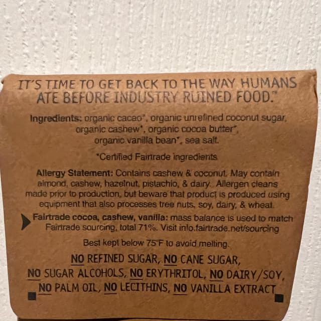 I found this at Walmart last year. I’m not sure if they still carry it there. I stopped buying chocolate because it’s so expensive right now. Anyways, this was very good! Loved the cashew butter filling. It balances the dark chocolate out. It was a smooth, creamy, delicious chocolate bar. I’d definitely get this again if it wasn’t so expensive. I love that the packaging is completely compostable!