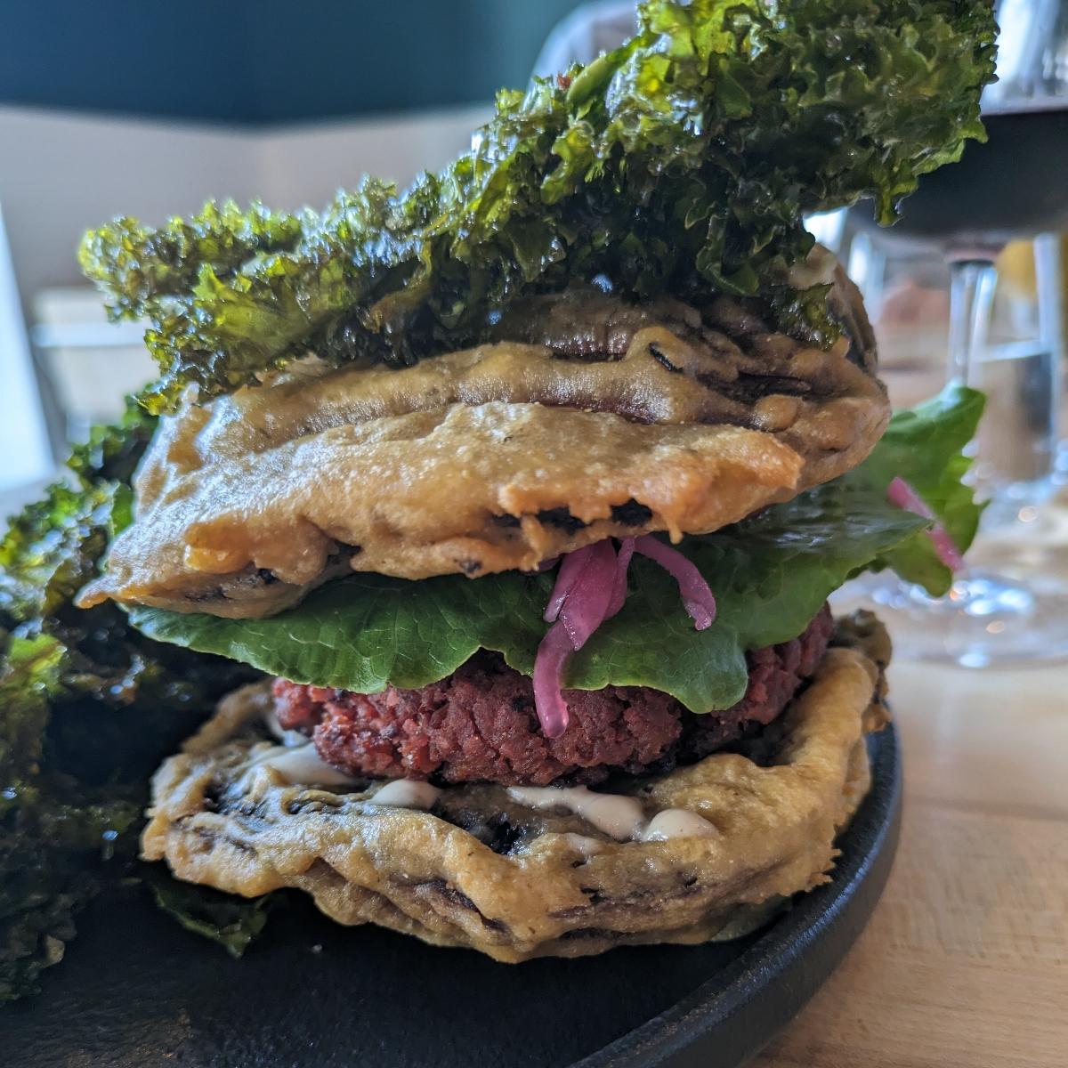 This is a very unique take on a #plantedbased #cheeseburger. The bun is tempura fried #mushroom with a #lentil and #tofu patty, pickled onion, lettuce, tomato, seeded mustard, and brie. I didn't really taste or see much brie, but I also didn't feel like anything was missing. It was enormous and very filling. Pricey as everything is here, but delicious as always