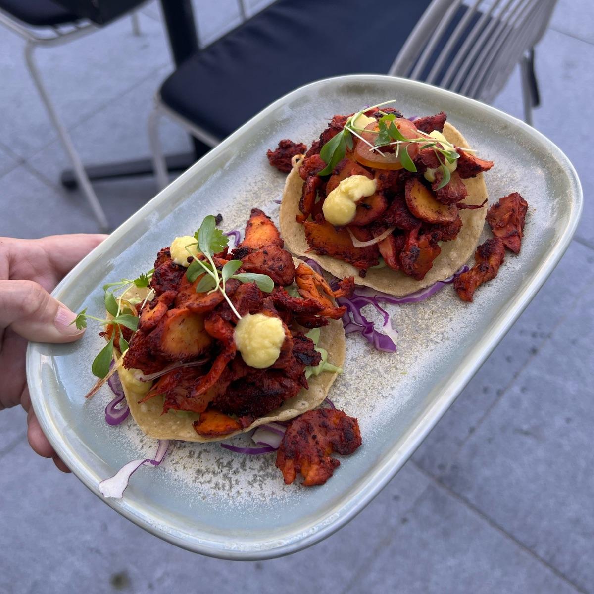 It has achiote,avocado,cherry tomato,shallot and sweet corn in tortilla