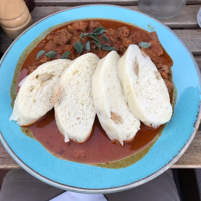 A scrumptious vegan goulash dish with a rich tomato sauce, soy pieces, cabbage and some lovely dumplings to soak it all up.