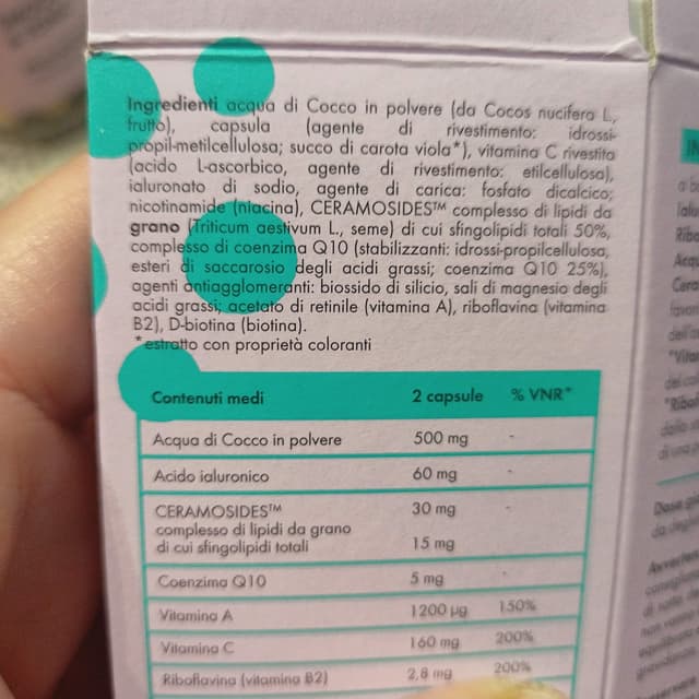 Capsule vegetali con vit C , riboflavina ,acido ialuronico e ceramosides per aiutare la pelle. Era in regalo con l'ultimo ordine fatto su goovi