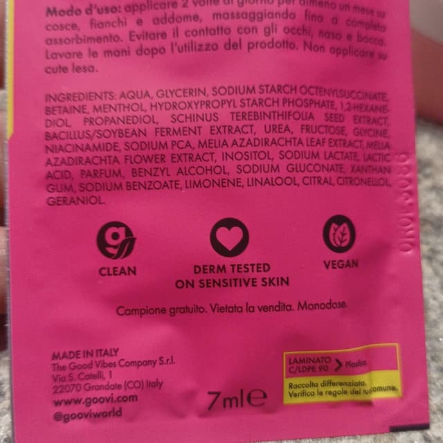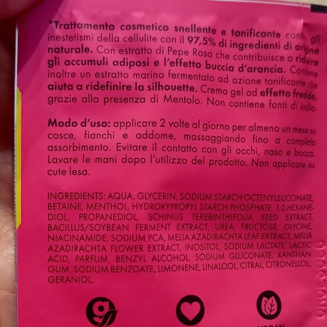 Campioncino monodose di una crema anticellulite al pepe rosa , estratto marino fermentato e mentolo. Ovviamente l cellulite non può andare via con una crema infatti io non la comprarò ma era in omaggio con l'ultimo ordine. Posso dire che ha un effetto freddo piacevole in estate per la presenza del mentolo