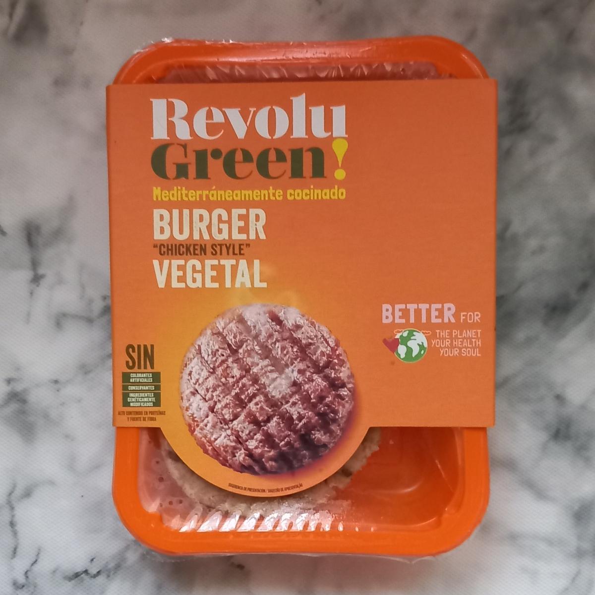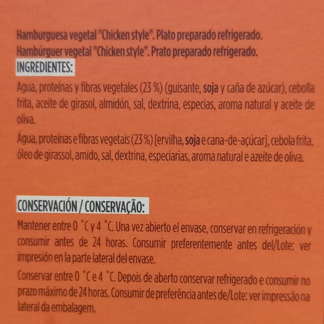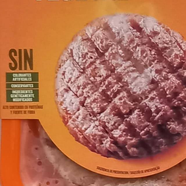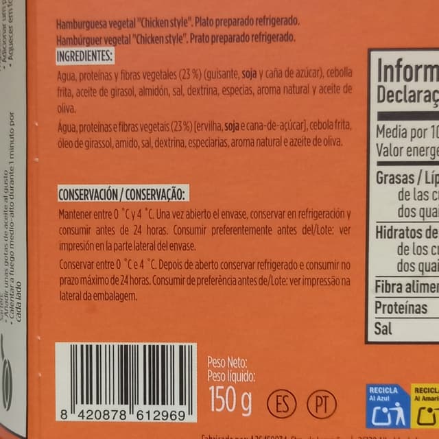 Hamburguesa vegetal "chicken style". Sin colorantes artificiales. Sin conservantes. Sin ingredientes genéticamente modificados. Alto contenido de proteínas. Fuente de fibra. Blíster de plástico y cartón. 150g.