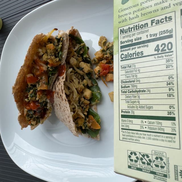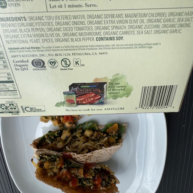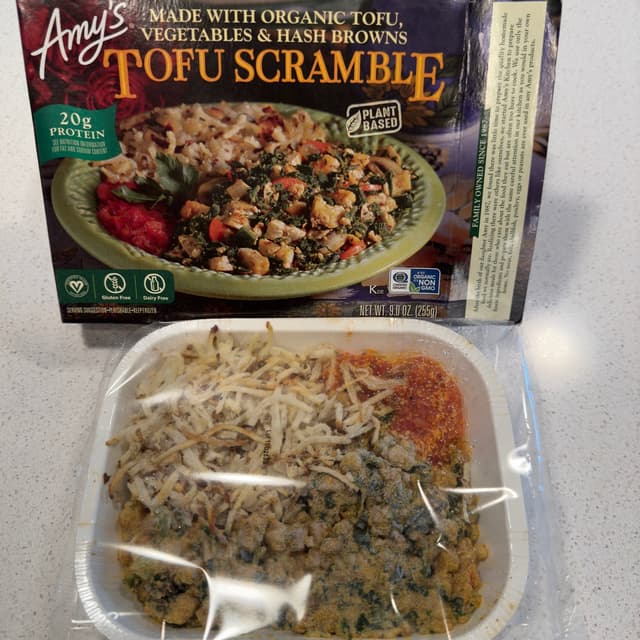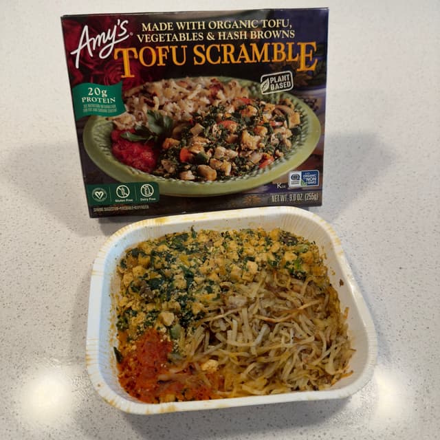 Tofu scramble with all the fixings!! Amy’s makes some really good microwave meals and this one I’m not gonna lie is hearty and tasty! I just needed to add hot sauce cuz you know #welikeitspicy 🥵🌶️😉!!! Loaded with veggies, spices, and nooch and served with a side of hash browns with a little tomato sauce I think. This I kid you not is a good portion that will keep you full for hours!