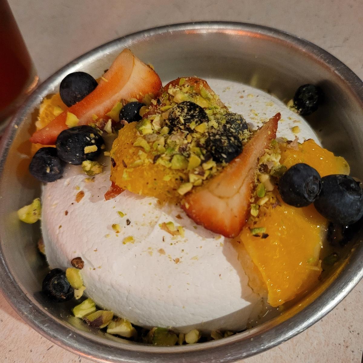 Merengue vegano con crema de limón y frutas de estación. En la carta dice que tiene crema chantilli vegana pero lo pedí varias veces y nunca le pusieron. Muy rico sabor y buen precio, aunque un poco escasa la crema de limón. Precio a octubre 2023 $1100.