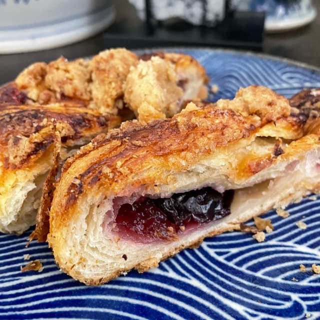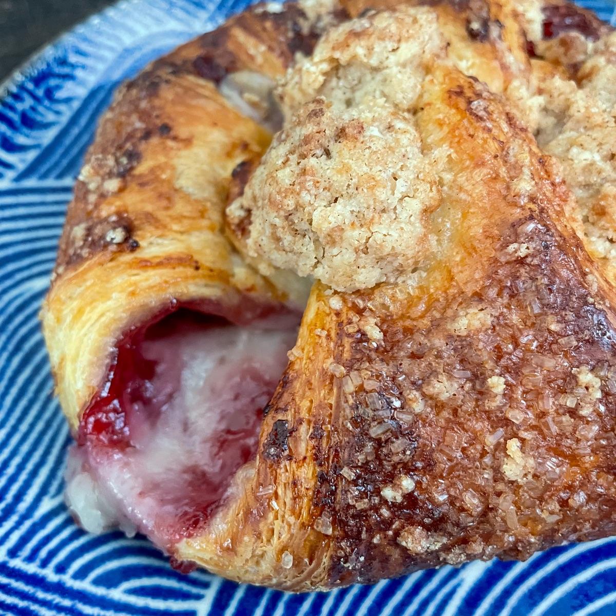 “Flaky danish pocket filled with dark cherry preserves and topped with streusel” (Menu description.)