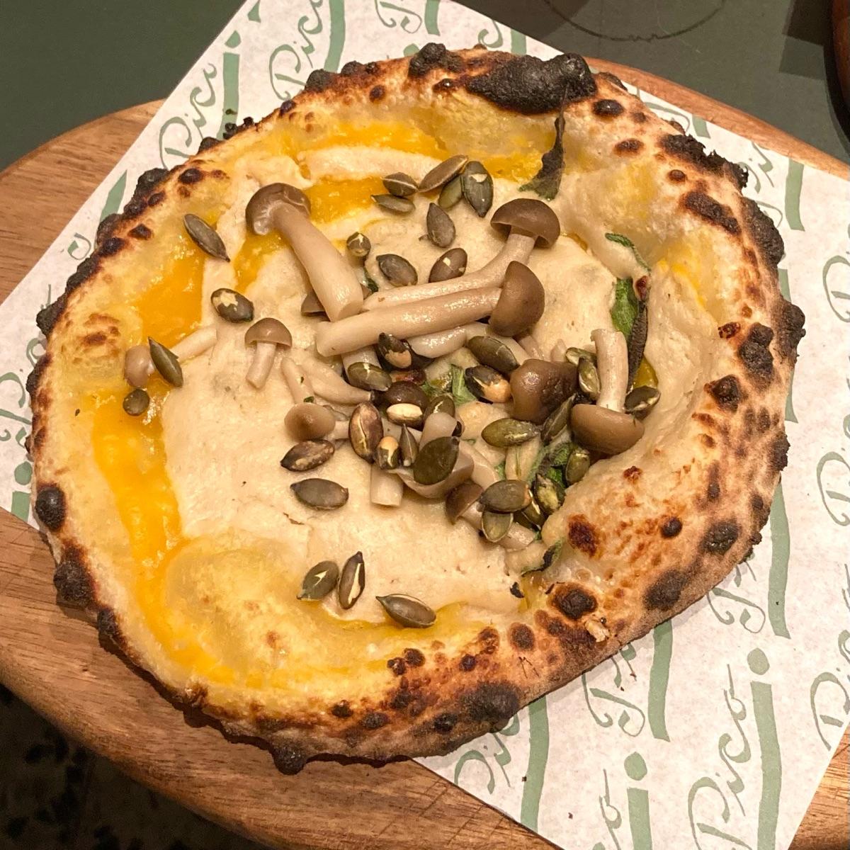 This might actually be one of the best pizzas I have ever had ❤️🔥 It has butternut squash purée and cashew cream as a basis, and is topped with pickled brown beech mushroom, sage, toasted pumpkin seeds and olive oil. The combination is one of a kind and everything comes together so well. Note that this pizza combines sweet and savoury flavours so if you’re not into this you might want to try Pico’s other vegan options (they have plenty!!) 🍕
