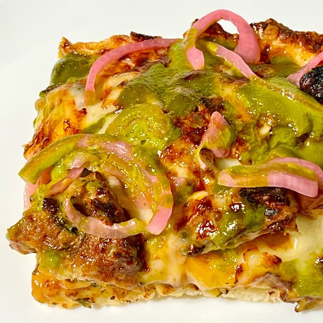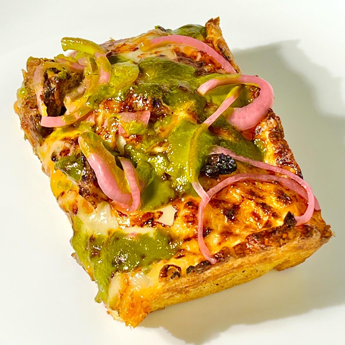 This consisted of luscious melty Good PLANeT Foods 🐮🥛-free mozzarella and cheddar, meaty 🐮-free steak, tangy pickled red onions, and vibrant, herby cilantro lime aioli on a thick sourdough crust with crisp edges and a light and airy crumb inside. The combination of meaty, cheesy, and delicious complementary flavors was intensely satisfying.