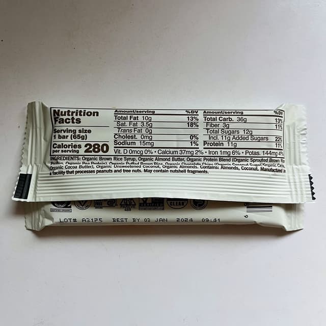 This bar features #coconut and #almondbutter, which I absolutely love, and #chocolate chips, which I tolerate. The shredded coconut is plentiful and definitely the most prominent element, but it doesn’t entirely remedy the textural issues. Despite being loaded with sugar, the taste was also flat and strangely muted.