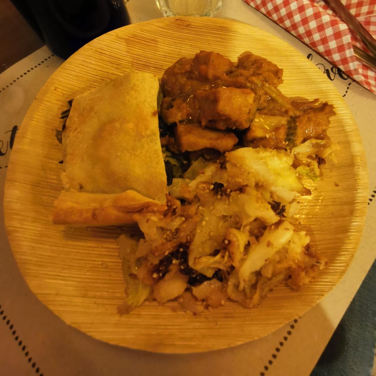 Tris composto da erbazzone, spezzatino di seitan e cavolo verza gratinato.