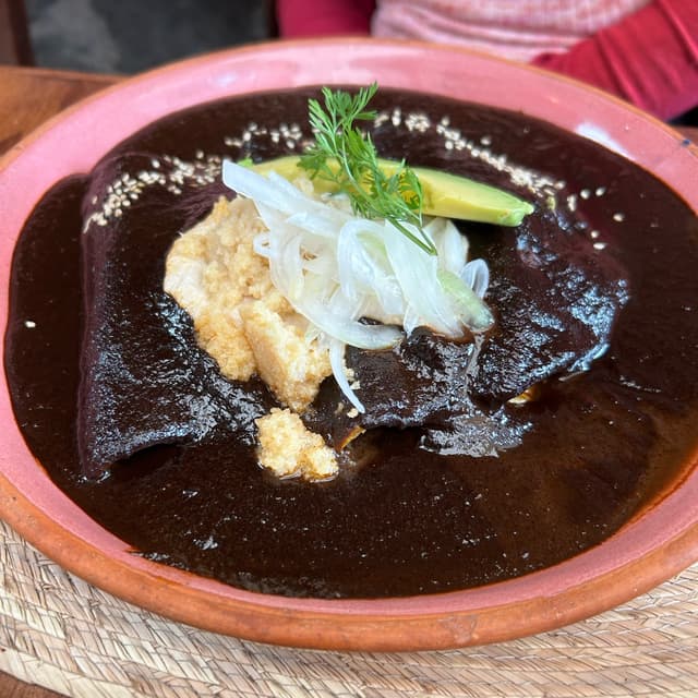 Delicious mole enchiladas filled with banana and topped with vegan cheese. The mole was amazing, very complex full with all the baroque flavors of this Oaxacan sauce.
