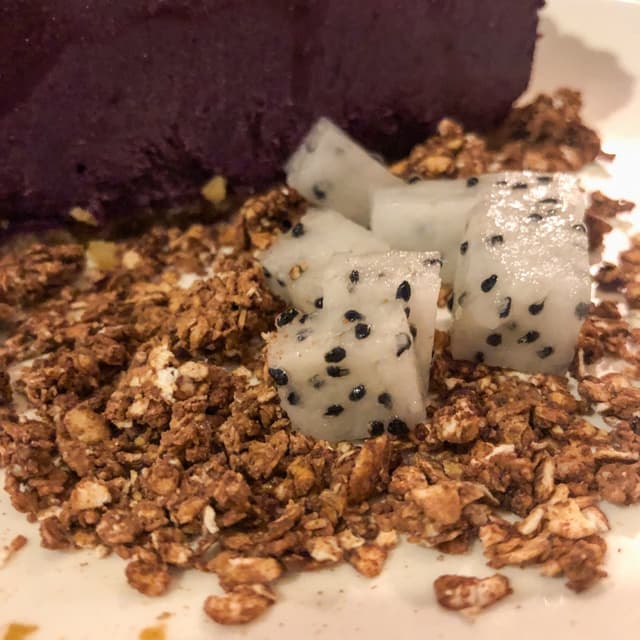 The #cashewcream was balanced in creaminess and fruitiness 😙 The #walnut crust crumbs were nicely sweet with the #maplesyrup only to be watered down by the #dragonfruit cubes 😋 in a most welcomed way 😛 Thus, each mouthful of chocolatey #dates was never too decadent 👌