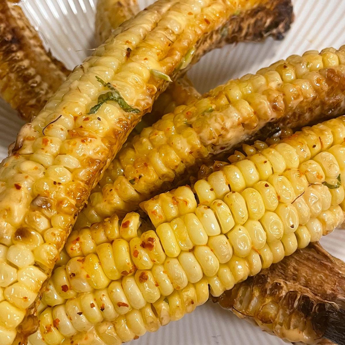 Slightly charred and tossed with vegan elote seasoning. Tons of flavor!