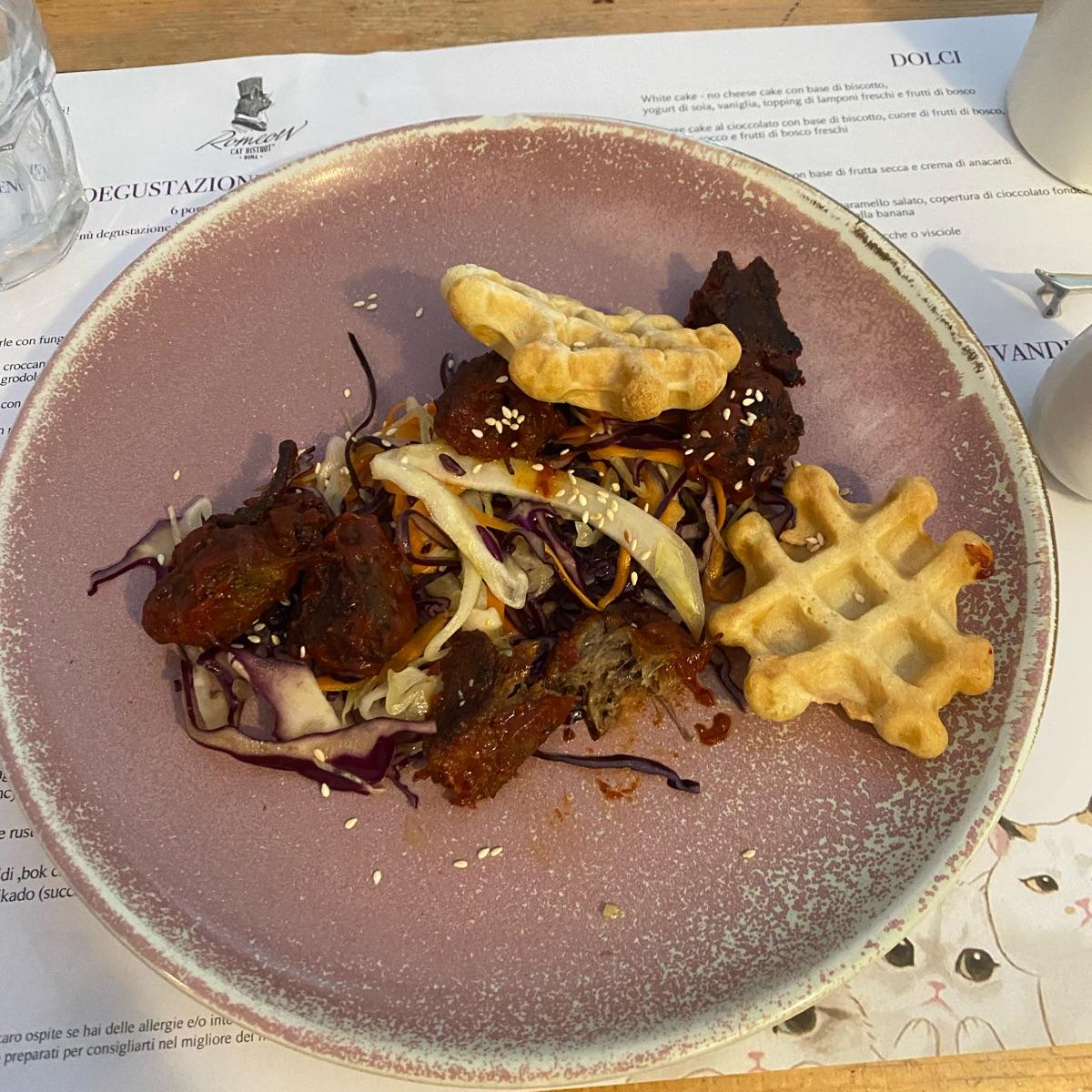 Questo è il piatto principale (pulled di shiitake con salsa bbq, waffle salato e coleslaw), non avevo mai provato nessuna preparazione presente in questo piatto, ma posso dire che è molto buono, la bbq speziata e piccantina, il waffle morbido, la coleslaw non mi fa impazzire come contorno ma era buona