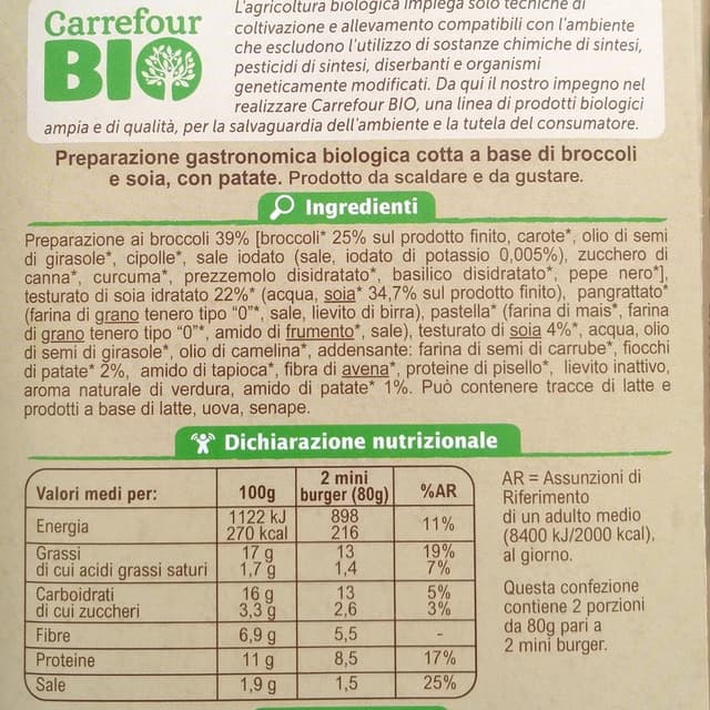 Sono dei miniburger biologici a base di broccoli e soia. Li ho trovati gustosi e saporiti (a me piacciono molto i broccoli), sono pronti velocemente e vanno bene quando si ha poco tempo per cucinare.
