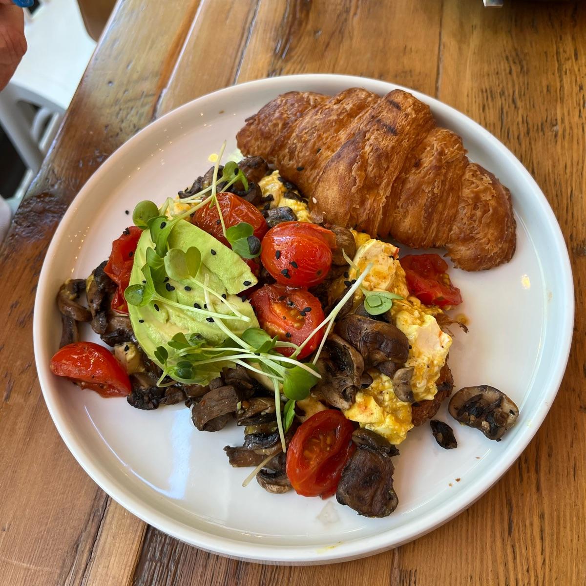 Croissant with tofu scramble, tomato, avo and grilled mushrooms. 🍄