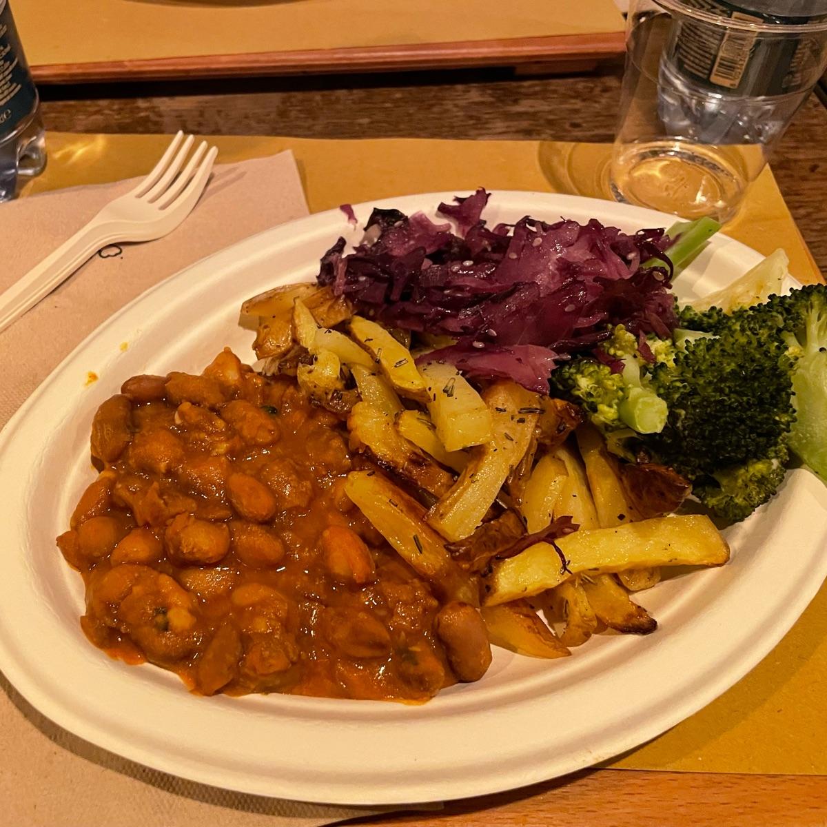 un tris composto da fagioli al pomodoro patate al forno, broccoli al vapore e cavolo rosso in agrodolce tutto buonissimo e sfizioso mangiato dopo la manifestazione a milano!