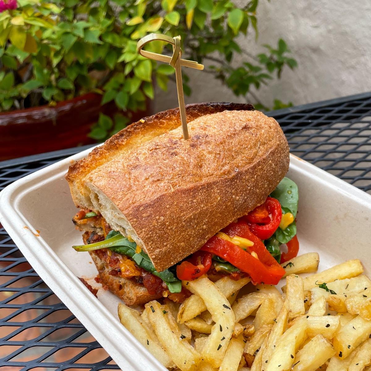 Vegan Mozzarella, Panko Crusted Eggplant, Calabacitas, Spinach, Basil, Roasted Red Peppers & House Red Sauce-served on locally baked Barrio Bread!