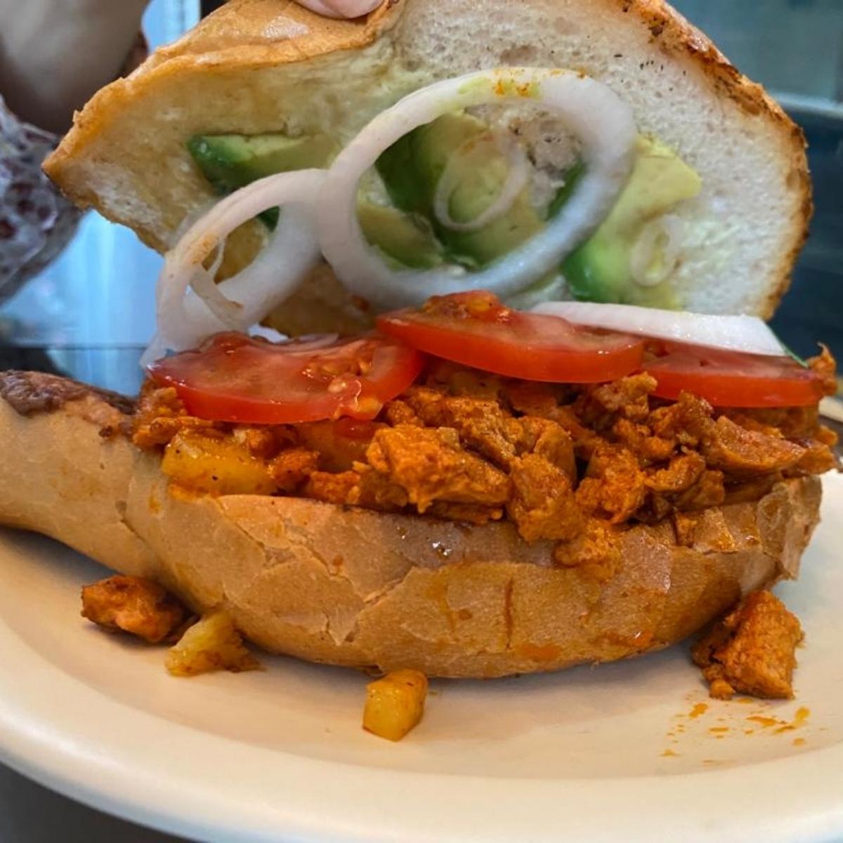La torta no está mal pero sí le pondría más piña y quizá cocinar un poquito más el pastor, quedaría un poco más rico. El tamaño me parece pequeño, es del tamaño de un bolillo normal que por el precio sí me imaginaria algo un pelín más abundante y sobre todo que es un puestito en la calle, no un restaurante, está en $90. Si van ahí les recomiendo mejor la de choriqueso, aunque es $20 más cara, está mucho más buena! Les ponen poquitín de cebolla y aguacate y creo que frijoles pero ni los sentí.