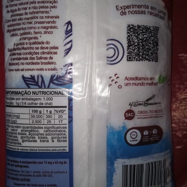 Sal Iodado natural, obtido por evaporação da água do mar, preservando os minerais. Não passa por refino, por isso eu prefiro.