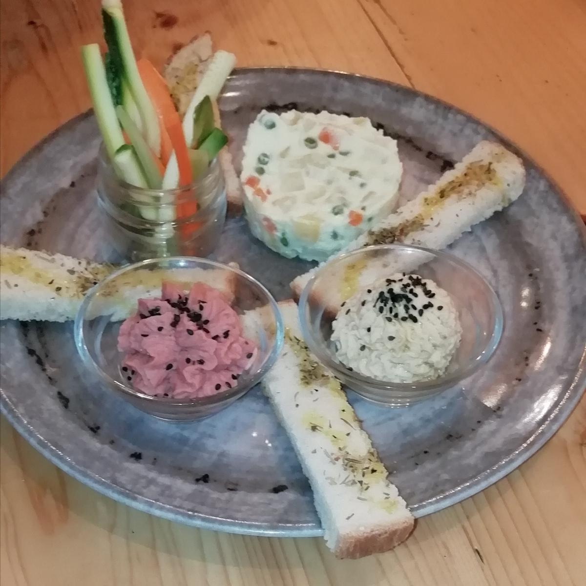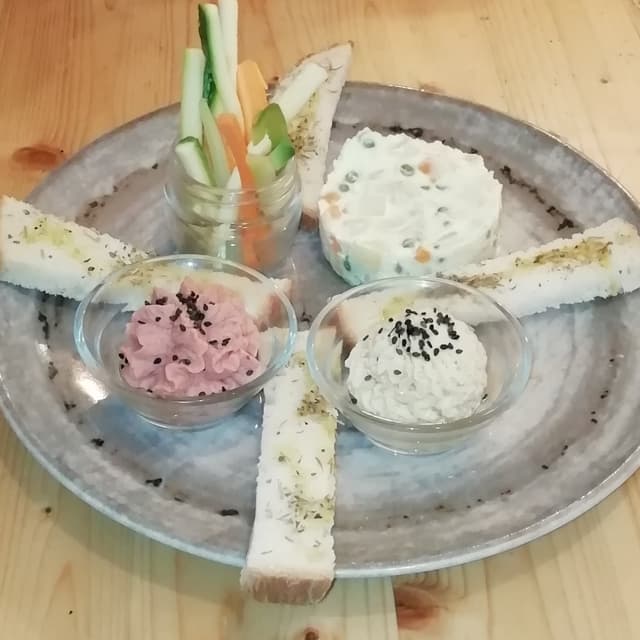Crudités miste per catturare l'hummus classico (che ho preferito) e quello alla barbabietola; insalata russa da gustare coi crostini conditi con erbe e un filo d'olio.