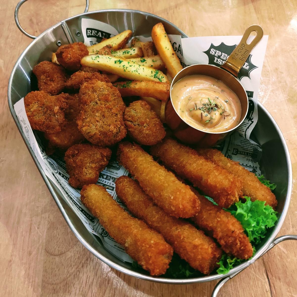 Looks like @dafnelately has already beaten me to this review 😏 I don't blame her because it is a fine piece of work, this 😋 Both the #eryngii fingers and the #hericiummushroom are beautifully battered and greased, while the #chips do well as the plate filler, and the #veganmayo has a weak taste that allows the flavours of the #deepfried #mushroom to shine 😀 #sweetdreamsaremadeofgrease indeed!