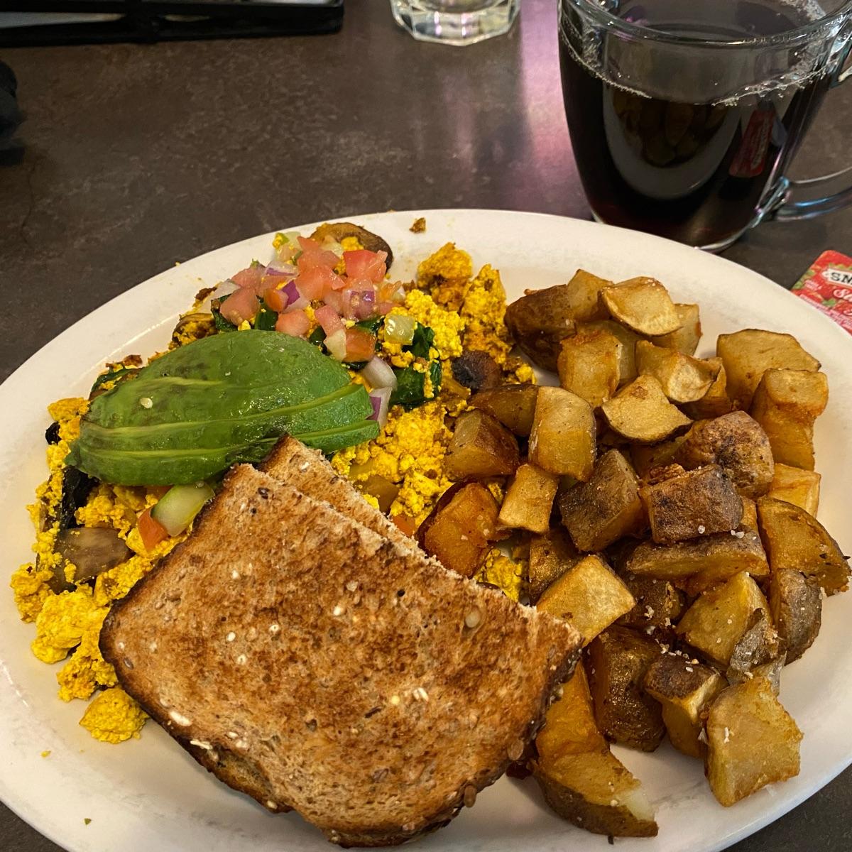 This tofu scramble was one of the best I’ve had. Seasoned perfectly with lots of veggies, mushrooms, and black beans. The potatoes were off the charts! This is an old (est. 1970) diner style restaurant in Tacoma, WA and the ambiance and vibe was wonderful! I’d probably go back almost every weekend if I lived in Tacoma. The scramble was 16.99 + $1.99 extra for Field Roast chorizo. I got multi-grain toast with vegan margarine that was included. Plenty of food! I also got an OJ for $3.99 and a cup of coffee for $3.99. They had a machine that makes fresh-squeezed OJ right at the counter, but it wasn’t working when I was in. Altogether a wonderful breakfast experience!