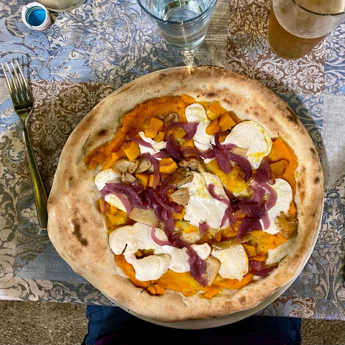 Pizza bianca con la buonissima mozzarella di Dreamfarm 😍 Crema di zucca mantovana, porcini e cipolle rosse caramellate. Per renderla perfetta servirebbe qualcosa di più a contrastare i sapori dolci dati da zucca e cipolle, ma già così è ottima. Magari della pancetta o salsiccia? 😏
