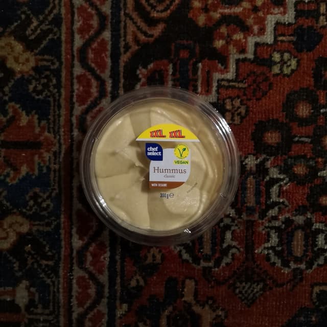 Hummus classico con sesamo di chef select, in questo in grosso formato, dal momento che questo prodotto fa parte della settimana xxl. Prezzo super economico, molto buono, sa molto di sesamo e il limone si sente veramente poco. Buonissimo