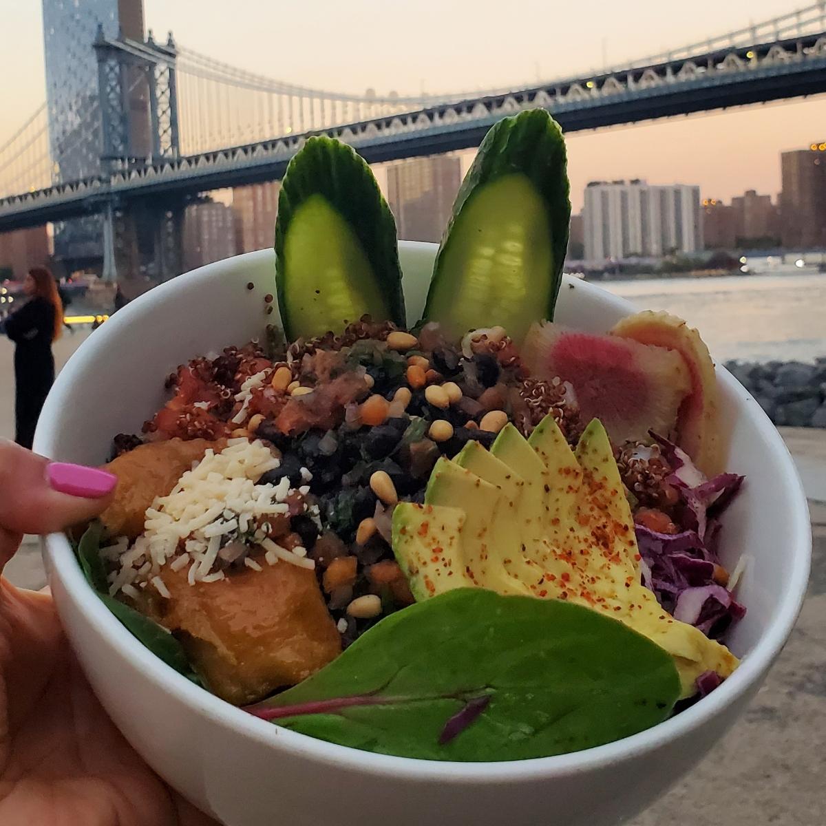 I visited NYC and walked the Brooklyn Bridge, and got to Timeout Market and there I found a vegan spot Bklyn Wild and tried this delicious Feliz bowl!! So good, I was starving, the bowl had quinoa, plantains, black beans, lettuce and some other green veggies, avocado, radish ..was soo good!! . Finally some vegan food here in NYC, I had had only sandwiches in my meeting, and they're not good. But this bowlwas great