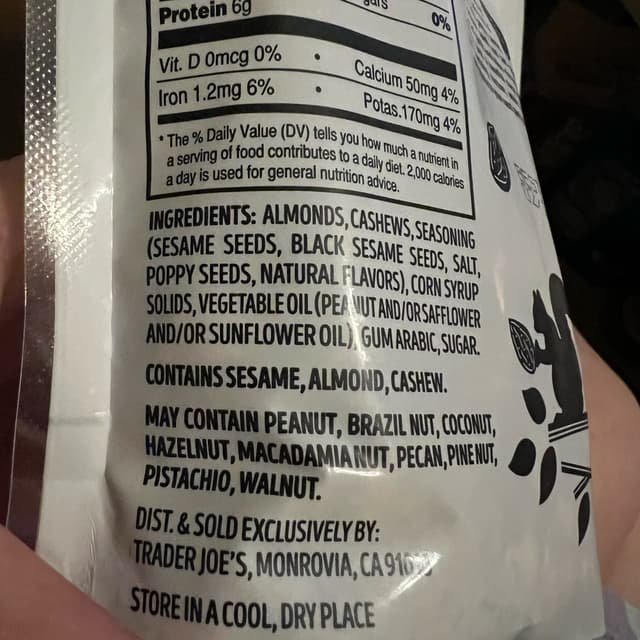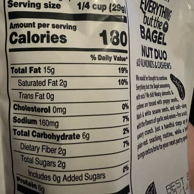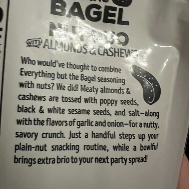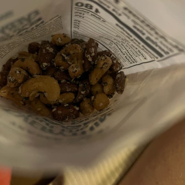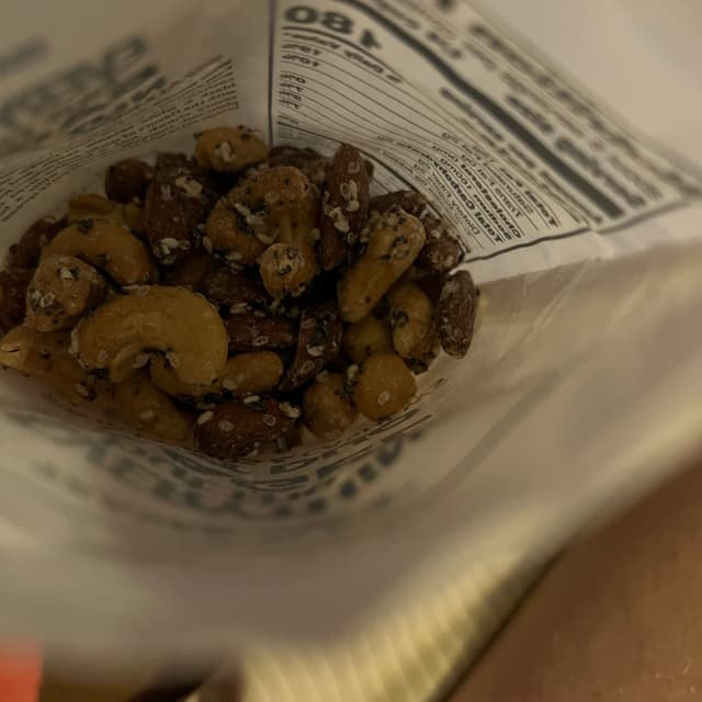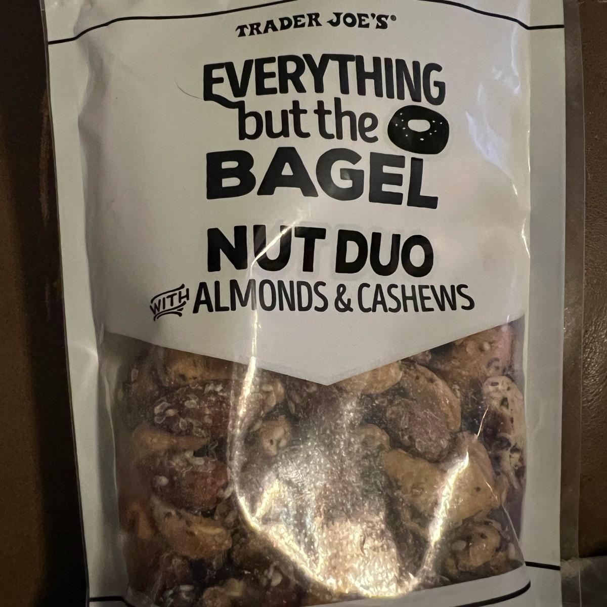 This nut duo with everything but the bagel spice is so good crunchy cashews and almonds coated with the spice nice and balanced not over spiced . I love Trader Joe’s and these did not disappoint . I will definitely buy again.