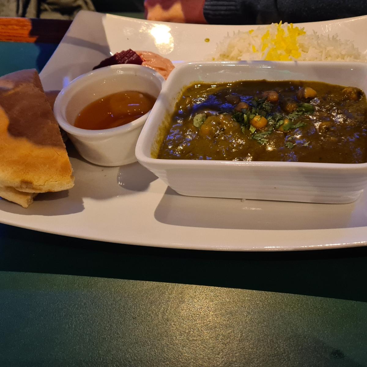 Delicious spinach based curry. Comes with naan, mango chutney, rice, and hummus.