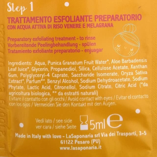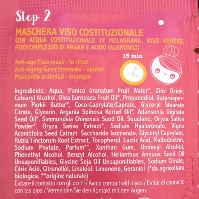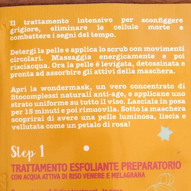 È una maschera da usare in due fasi, una dopo l'altra. Prima l'esfoliante, delicato ed efficace, poi la nutriente che si tiene per circa 15 minuti, lasciano la pelle liscissima e nutrita. Hanno un profumo che trovo molto gradevole, tra il fruttato e floreale e il prezzo è modico per il valore del prodotto.