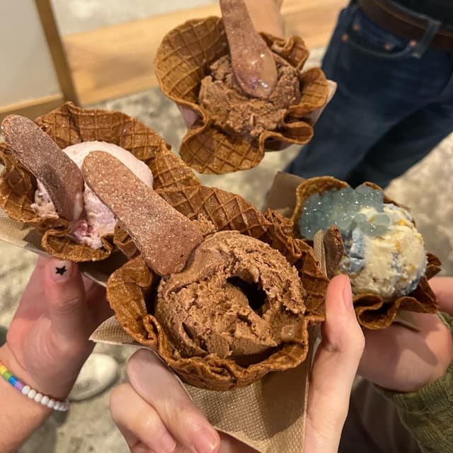 ¡DELICIOSO! Amé esta nieve de chocolate, me supo a gloria, jaja. La canastita estaba muy rica también y fui fan de que incluso la cucharita fuera comestible. Mi hermano pidió el de fresa y mi hermana el “De a mar”, y también salieron encantados. Muy recomendado todo lo que ofrece este lugar 🤍