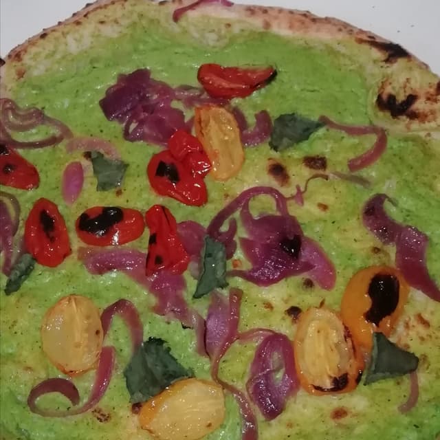 Morale: la crema verde probabilmente è di fave (che loro utilizzano spesso) ma non posso assicurarlo. Poi ci sono i pomodorini rossi e gialli e la cipolla rossa (buona!).