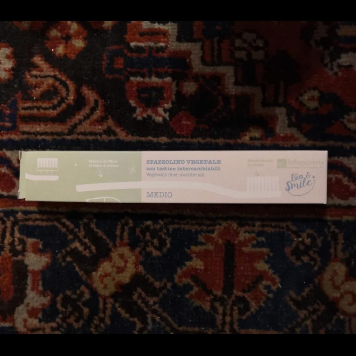 Spazzolino vegetale setole medie di la saponaria. Allora, mi sono trovata molto bene, prezzo buono, e prezzo delle ricariche ottimo rispetto ad altri brand, non è molto carino esteticamente, ma non è molto importante.