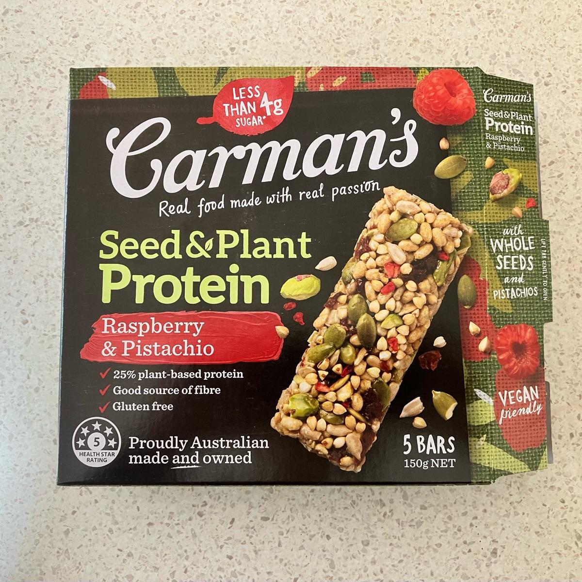 Photo 1: Front of the cardboard box packaging Carman’s Seed & Plant Protein Raspberry & Pistachio muesli bars. Labels say “Less than 4g sugar. 25% plant-based protein. Good source of fibre. Gluten free. 5 Health Star Rating. Australian Made & Owned. 5 bars. Vegan Friendly.”