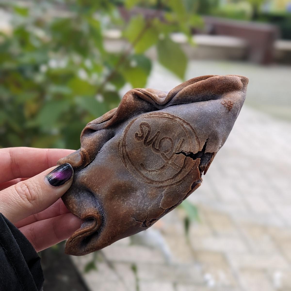 This is the other sweet option, and I'd recommend it over the chocolate banana. It's like an apple pie, although I still think it needs something to dip it in. The filling is gooey making it less dry. The dough is colored with butterfly pea flower. I love that their doughs are so colorful and are made that way with natural plant ingredients!